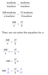 (Ans): We can set up a proportional relationship using equivalent student-to-teacher ratios. If we plug in known values and use x to represent the number of teachers: